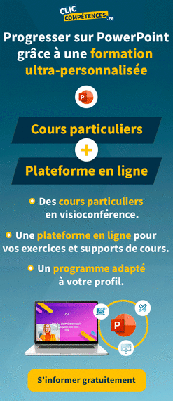 Vous pouvez également évaluer votre niveau de compétences sur PowerPoint en effectuant nos tests en ligne. Quel que soit votre niveau, Clic Compétences vous aide à valoriser votre CV et à saisir de nouvelles opportunités professionnelles. N’hésitez plus, contactez-nous pour en savoir plus sur nos formations PowerPoint sur-mesure.